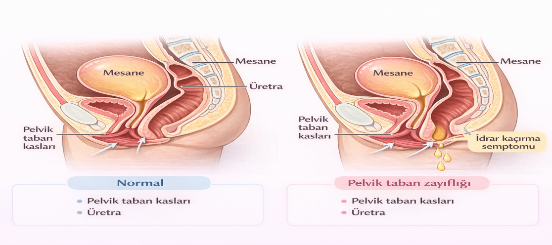 Pelvik taban kasları ve bağları idrar kesesini ve idrar yolunu destekleyen bir sistem olarak işlev görür. Bu yapı zayıfladığında idrar kesesi tabanı yeterince desteklenemez ve küçük miktar idrar bile kaçırma ile sonuçlanabilir. Ayrıca öksürme, hapşırma, yürüyüş veya spor gibi aktiviteler sırasında kontrolsüz idrar kaçırma görülebilir.
