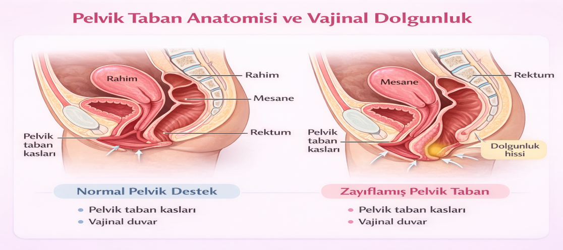 Vajinal dolgunluk, pelvik taban yapılarının güçsüzleşmesi ve bağ dokularının gevşemesi sonucu vajina duvarlarının doğal sıkılığını ve hacmini kaybetmesiyle ilgili bir durumdur. Pelvik taban cerrahisi içeriğinde belirtildiği gibi doğumlar, yaşlanma ve pelvik taban zayıflığı vajinal dokuların elastikiyetini olumsuz etkileyebilir ve vajina duvarlarının genişlemesine yol açabilir. Böylece normalde hissedilen dolgunluk azalır ve rahatsızlık hissi oluşabilir.